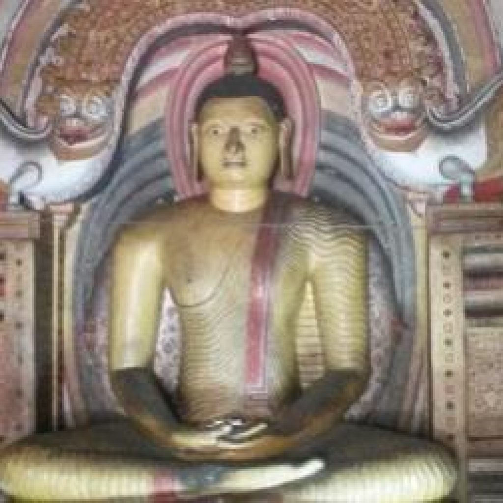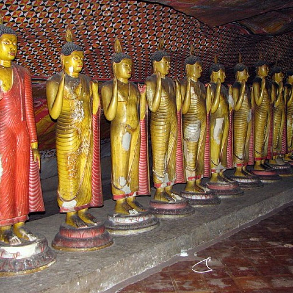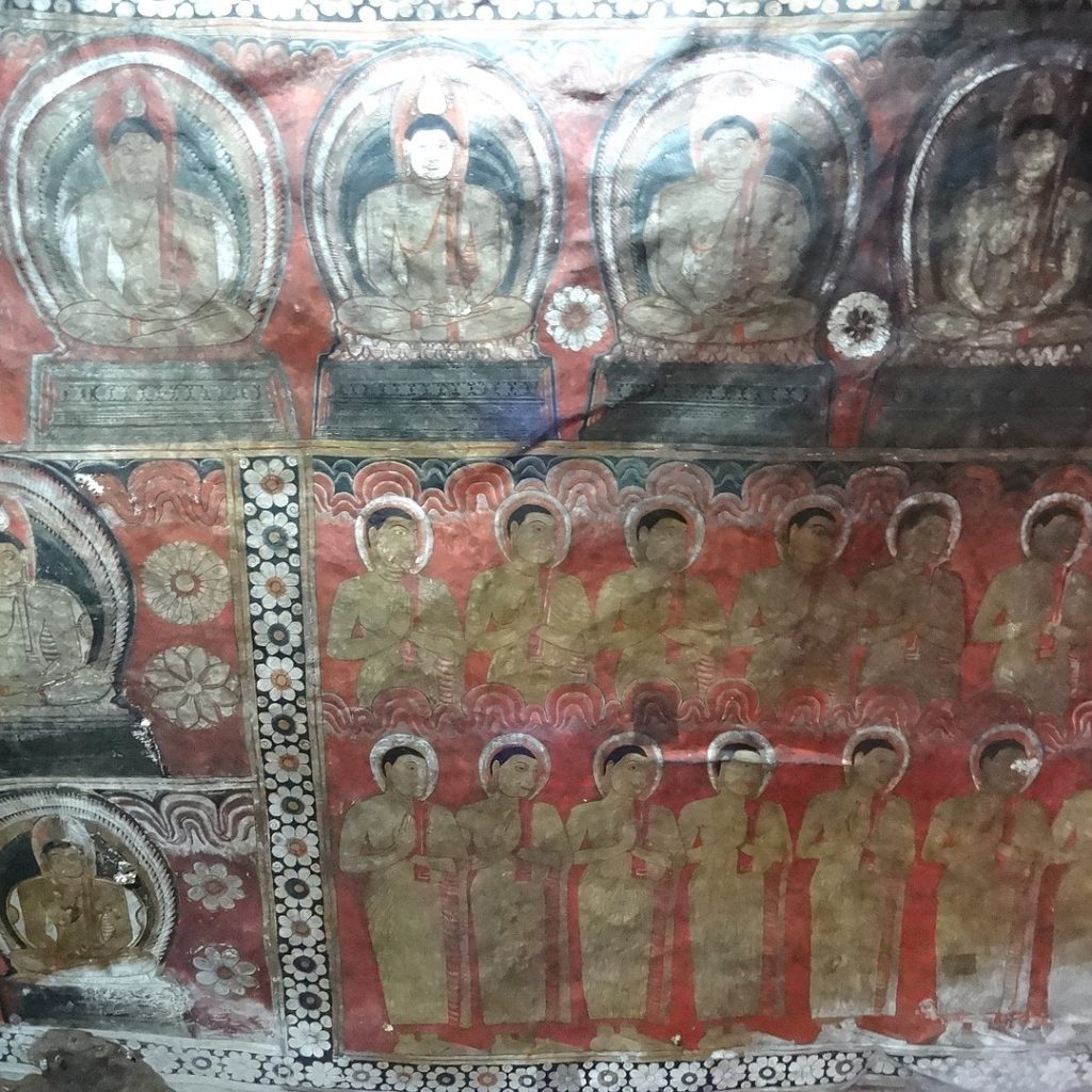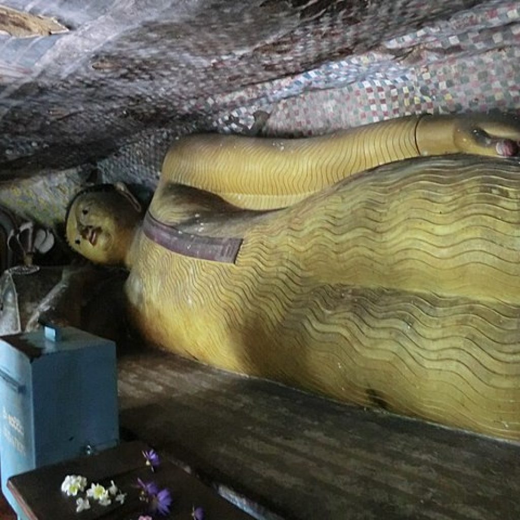 Behind the principal standing Buddha image to which people pay daily homage with the offering of flowers; there are two of Lanka’s Guardian Deities Vishnu and Saman while painted on the rock are depictions of God Skanda also known as God Kataragama and God Ganesh. A row of Buddhas possibly depicting the Buddhas before Gautama, line the cave’s edge while a rock hewn small stupa, with eight seated Buddhas facing the eight zonal directions, is situated near the entrance where also a painted wooden statue of King Walagamba, stands silent guard watching over the artistic wonder he created in thankful worship.