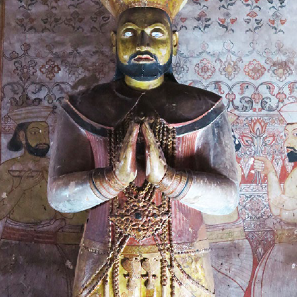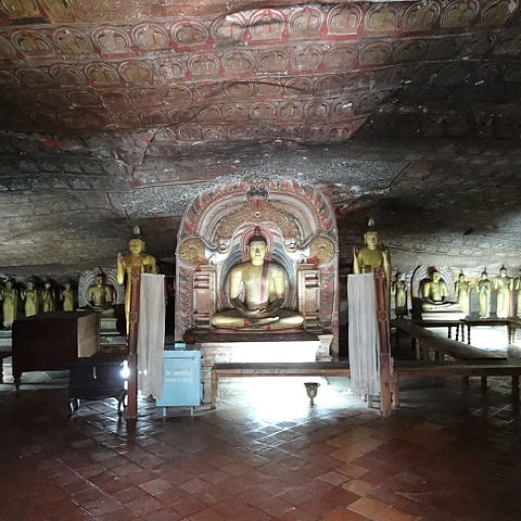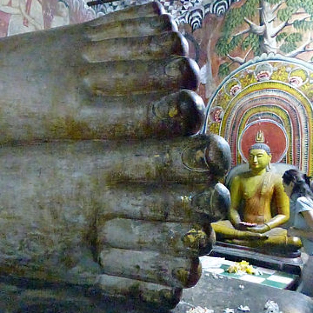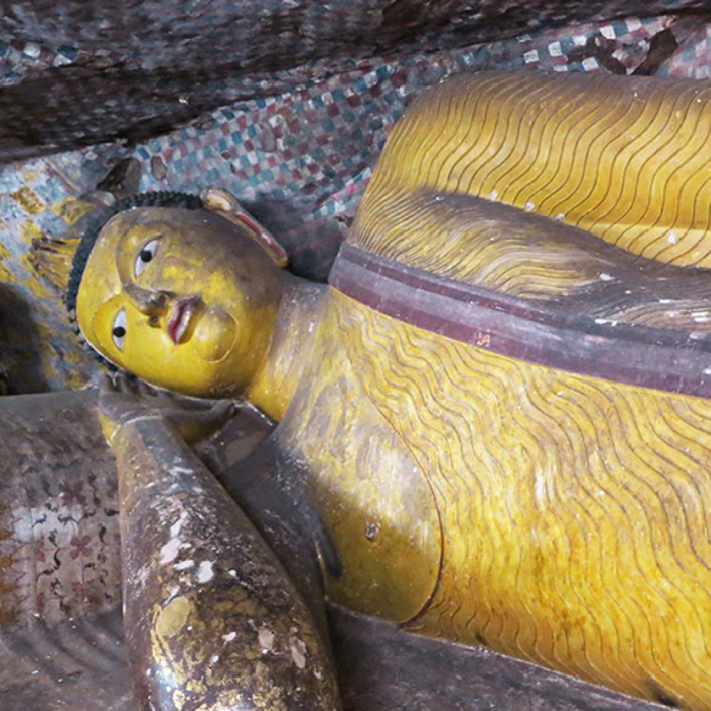 In this rocky shrine, the centrepiece of the entire chain of caves, the principal image is the standing Buddha but the most awe-inspiring figure is that of the 30ft recumbent Buddha, hewed out of the rock, the elegant features of which are more aquiline than the others present. Behind this image, in the ambulatory, stands the sculpted image of King Nissanka Malla who in the 12th Century became the royal benefactor and restored the temple to its old glory, adding more images and gilding 50 of them including the main standing Buddha statue and commissioned more paintings to enhance the cave’s beauty. An elaborate inscription recording his contribution survives on the rock face. It comprises of 25 lines and is engraved on the rock in the temple courtyard near the Murage (Guard House) occupying an area of approximately six feet by four feet.