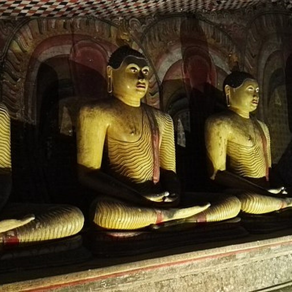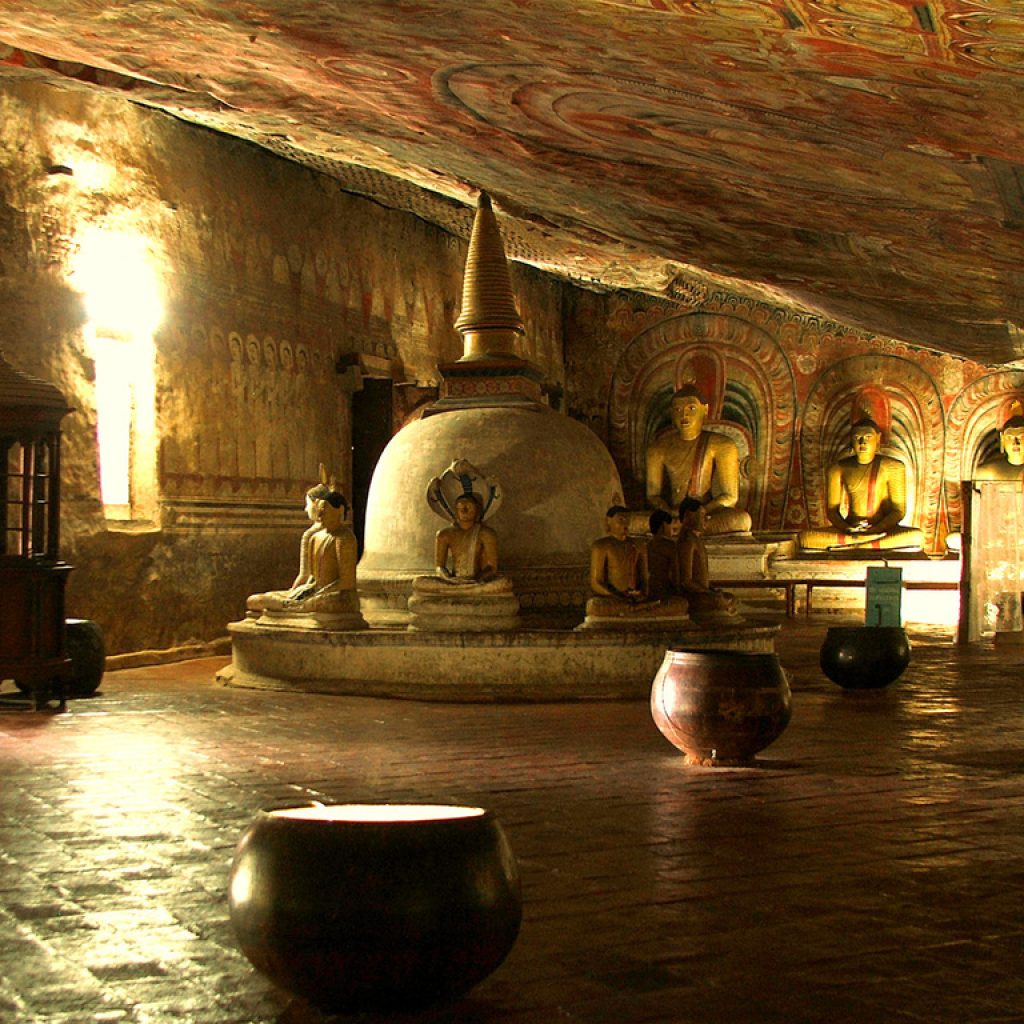 The uppermost caves of Dambulla’s southern rock face played host to the throbbing artistic impulses of the nation and became the hub of art and culture, of religion and ritual, of trade and commerce and the gateway from the arid plains of the Dry Zone to the wetlands of the central mountain range. For over 22 Centuries its vibrant life continued unabated, even as it does now sans pause: thanks to a royal line of duty conscious Sri Lankan kings who, determined to keep the flame alive and not let it die out with the winds of time, felt it their beholden duty to write over the fading manuscript of history, the peeling palimpsest of its artistic canvas and restore its wondrous art once more to pristine glory, the rock caves of Dambulla still glow with the silent serenity of a thousand Buddhas.