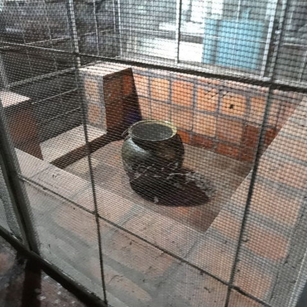 The largest of these chambers—the second cave—is the architectural masterpiece, the Maharajah Lena or the Cave of the Great Kings. It has been formed by the addition of screen walls in the centre of the cavern. From east to the west it is 52 metres long and goes 23 metres into the rock and has a maximum height of seven metres to the main screen wall. Two large doors provide entry from a wide galleried verandah that stretches throughout the cave length. Its large interior has not been compartmentalised but an intricate arrangement of statues and paintings have served to differentiate it. In the eastern sector from the rocky ceiling, drops of water drip ceaselessly from a still unknown source within the rock’s ceiling. The water, believed to contain healing properties, is collected in a large pot and is used exclusively for the daily temple offerings.