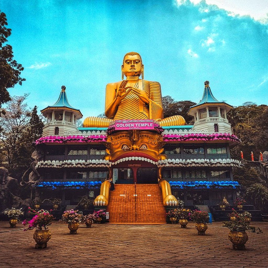 Upon arrival at the Dambulla Rock Temple the vista is dominated by a giant seated gold plated Buddha statue placed high over the newly built three storied Buddhist Museum. Unveiled in 2001 it occupies its position as a blessed sentinel overlooking the flatland that stretches for miles providing an uninterrupted view of the surroundings and casting protection on every living being below.